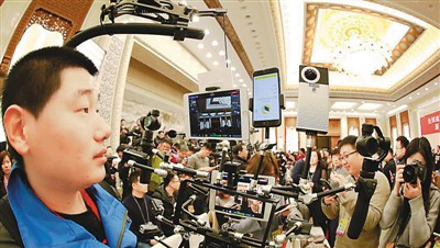 图为记者用约30斤重的多媒体“神器”采访,可实现在线15家新闻平台一键直播和VR直播。新华网发